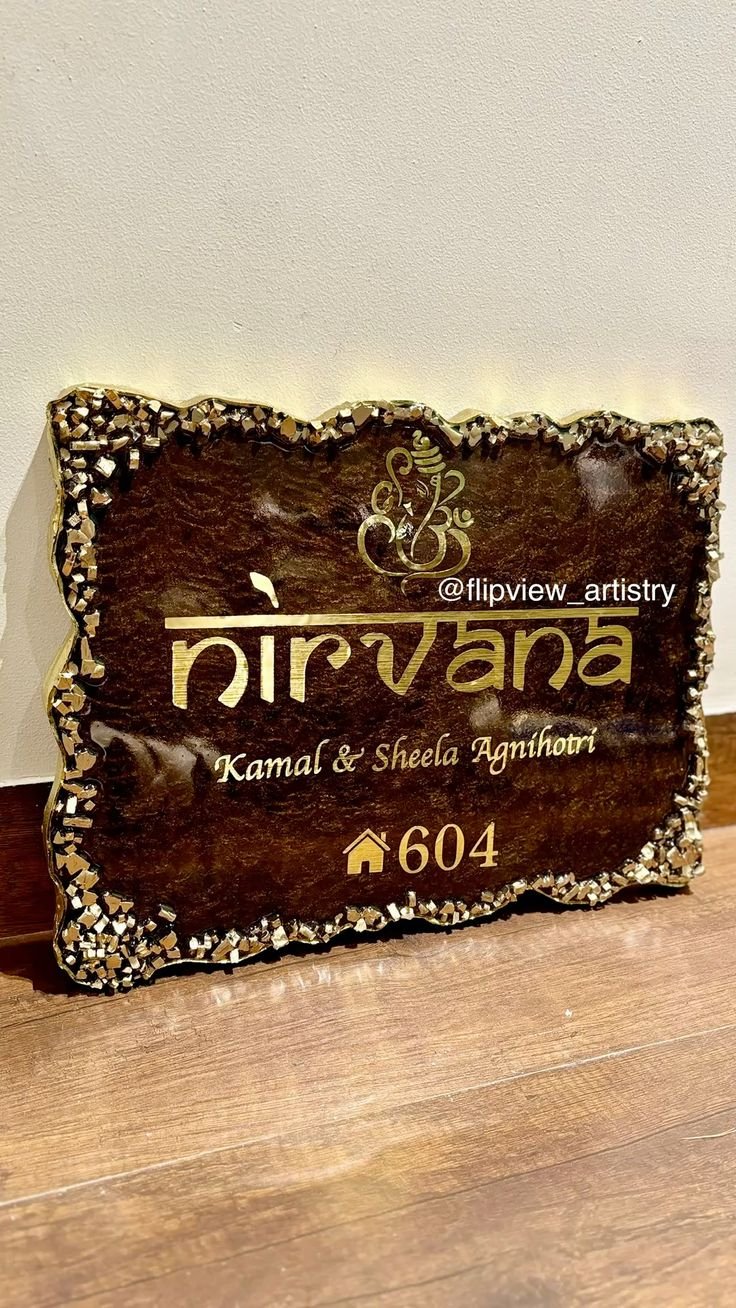 Personalized resin nameplates with glitter or floral designs.